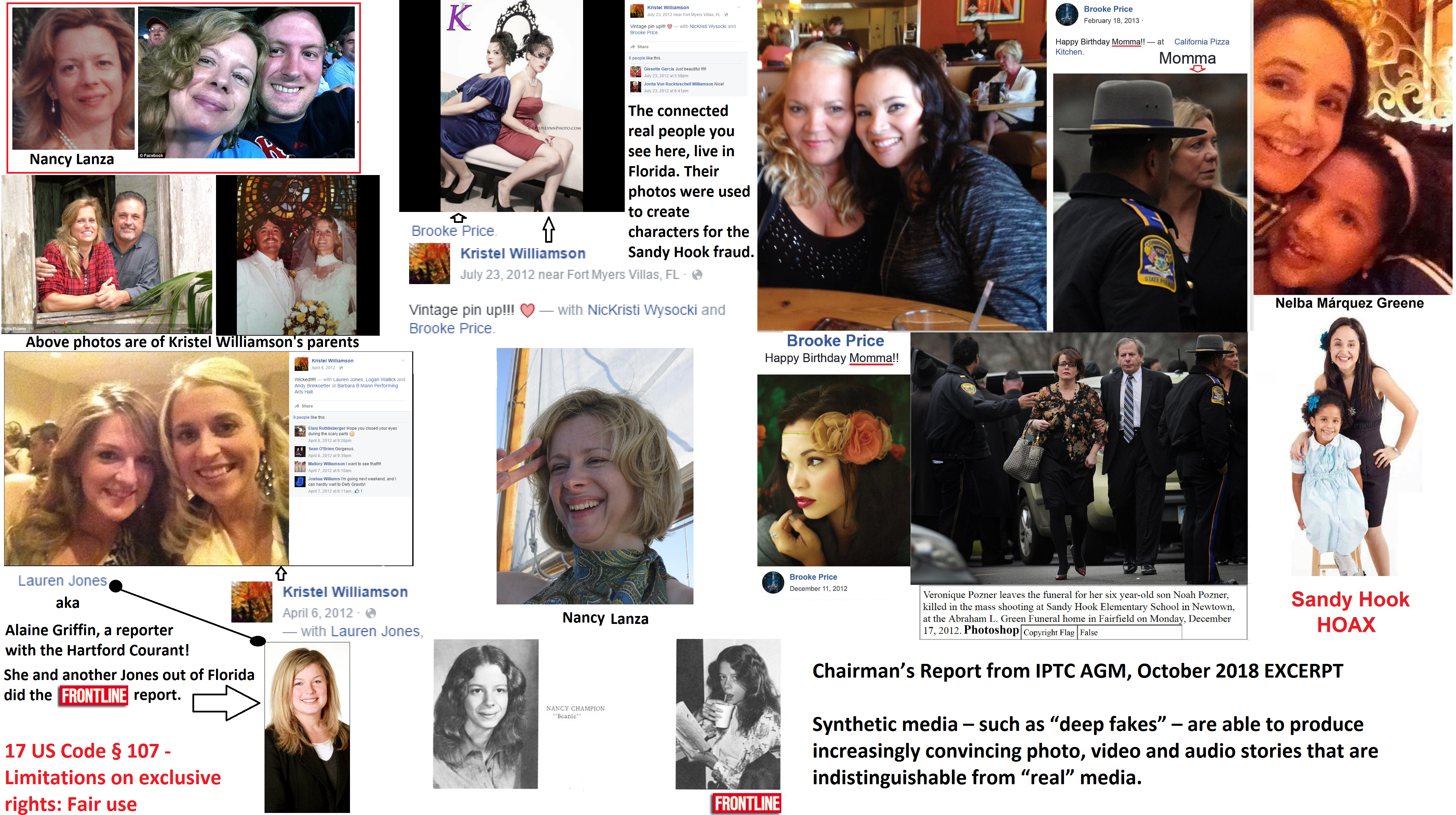 A well established pattern is fake events are brought up to support fake events. If you think the Lucy Richards case was real LOOK half way down in the photoshop block of the metadata to where it says “Slices Group Name” and note the entry says Lisa-Richard not Lucy Richards. https://www.nbcnews.com/news/us-news/conspiracy-theorist-arrested-death-threats-against-sandy-hook-parent-n693396 Caption under the computer graphic creatED Sandy Hoax character, Lucy Richards: “Hillsborough County Sheriff’s Office” Do you see credit to the Sheriff’s Office in the full METADATA? PEOPLE magazine, also, published a photo of Lucy Richards and here I have posted the principal component forensic view of that image.